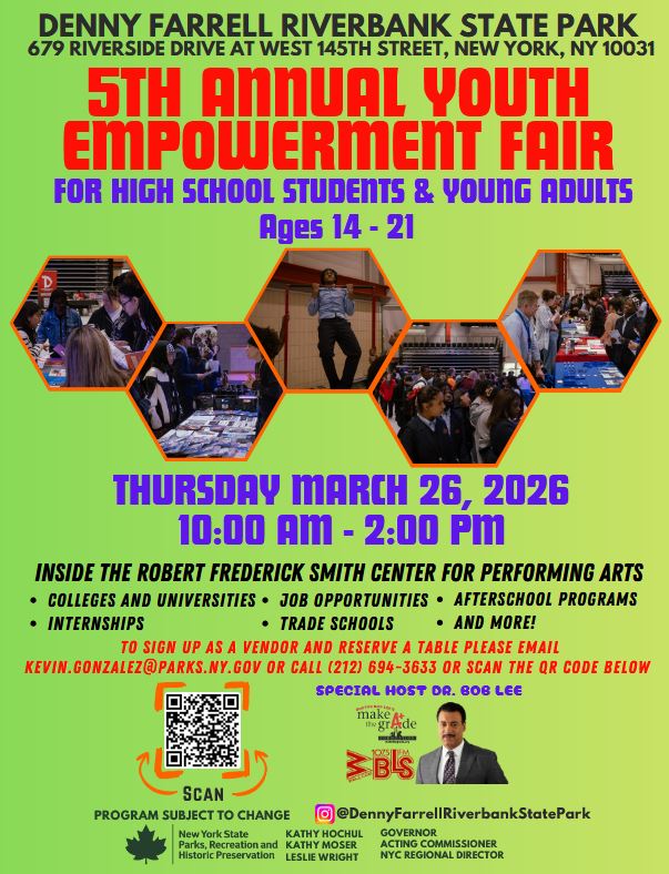 Manhattan Community Board 9 is pleased to share the upcoming 5th Annual Youth Empowerment Fair, taking place inside the Robert Frederick Smith Center for Performing Arts at Denny Farrell Riverbank State Park.