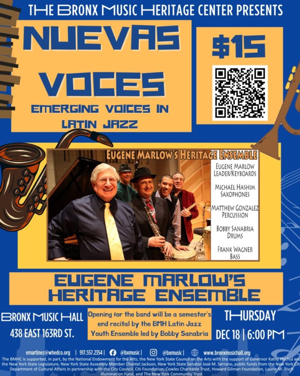 This special concert features Eugene Marlow’s Heritage Ensemble, a powerhouse group blending jazz and Afro-Caribbean rhythms with rich arrangements and soulful solos. The evening will open with a semester-end recital by the BMH Latin Jazz Youth Ensemble, led by renowned drummer and educator Bobby Sanabria, showcasing the next generation of Latin jazz talent.