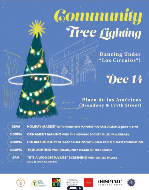 Tree Lighting on Plaza de las Americas! Holiday cheer on Plaza de las Americas and United Palace! Indoor Market with NoMAA + Ornament Making with Hispanic Society + Holiday Music on the Plaza + Movie at United Palace