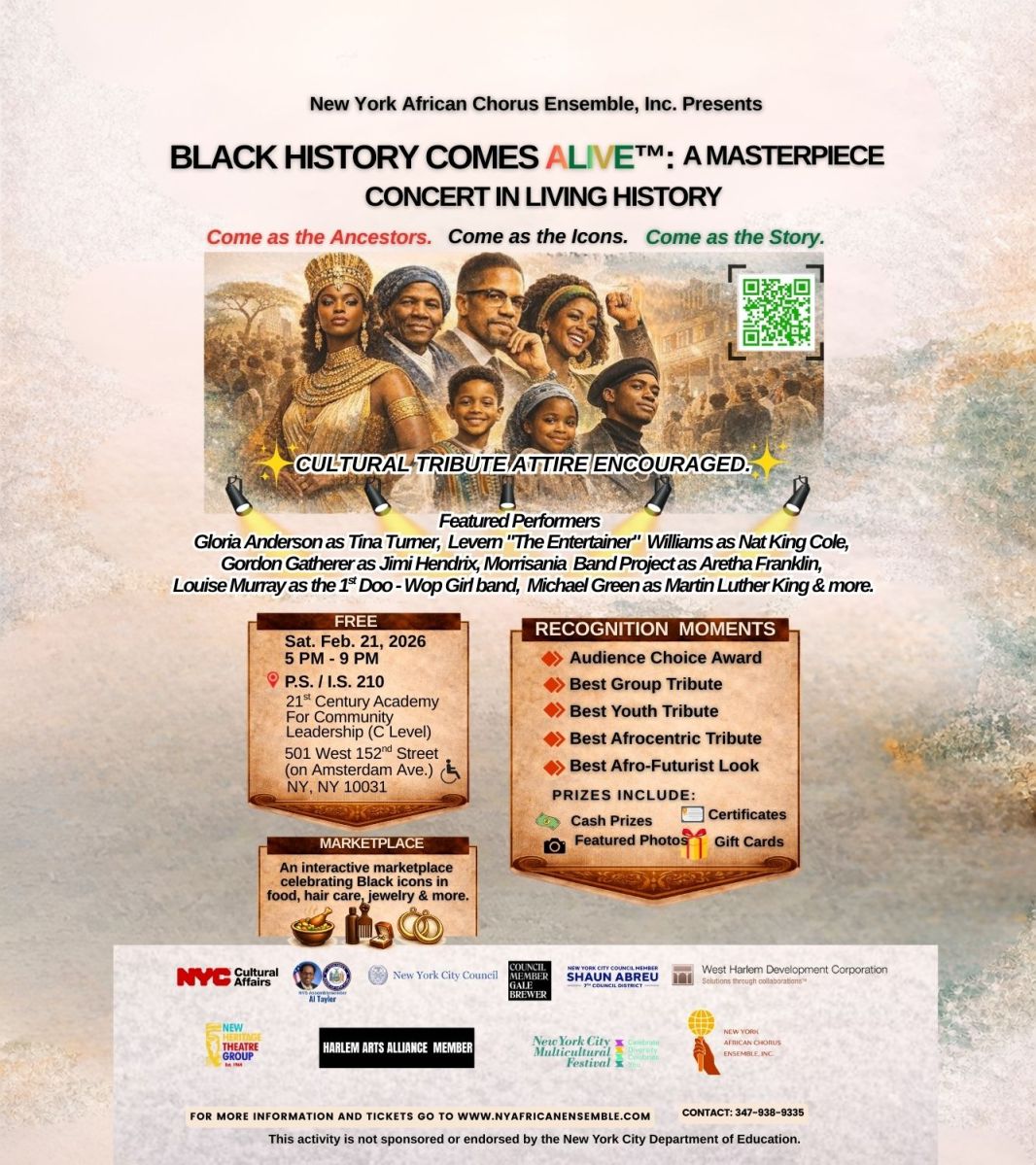 BLACK HISTORY COMES ALIVE™ is a groundbreaking Black History Month concert that turns traditional performance into a living museum of Black history. This concert invites both performers and audience members to arrive in Cultural Tribute Attire honoring Black historical figures, cultural icons, movements, and ancestral legacies. Rather than observing history from a distance, participants become history, walking, singing, dancing, and gathering as living embodiments of Black excellence across centuries and continents.