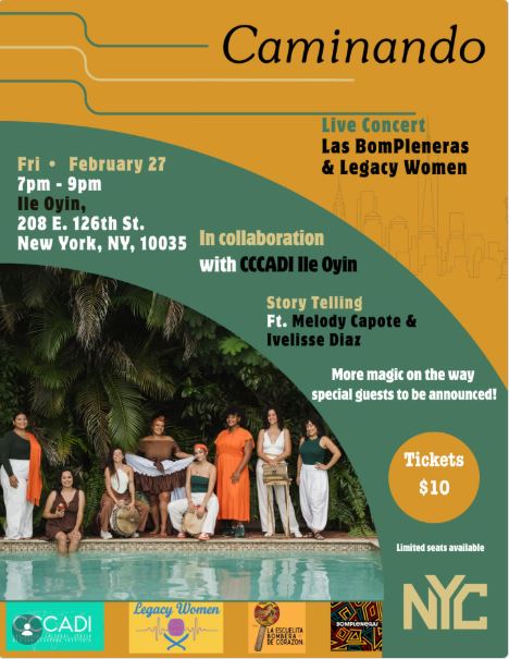 Join us for a powerful evening of music, storytelling, and community featuring Las BomPleneras & Legacy Women, with storytelling by Melody Capote & Ivelisse Diaz in collaboration with CCCADI at Ile Oyin! Bomba! Plena! Palo!