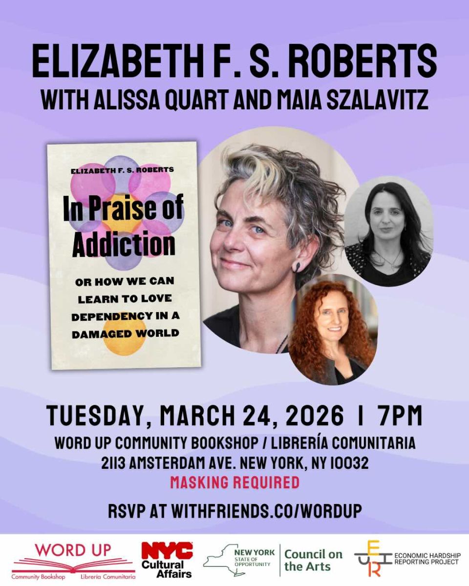 Word Up welcomes professor Elizabeth F. S. Roberts to discuss her new book In Praise of Addiction: Or How We Can Learn to Love Dependency in a Damaged World, a transformative way of understanding addiction--and an invitation to find connection in the pleasures of life we know are bad for us. In conversation with Roberts will be authors Alissa Quart (Bootstrapped: Liberating Ourselves from the American Dream and Squeezed: Why Our Families Can't Afford America) from the Economic Hardship Reporting Project and Maia Szalavitz (Undoing Drugs: How Harm Reduction is Changing the Future of Drugs and Addiction)