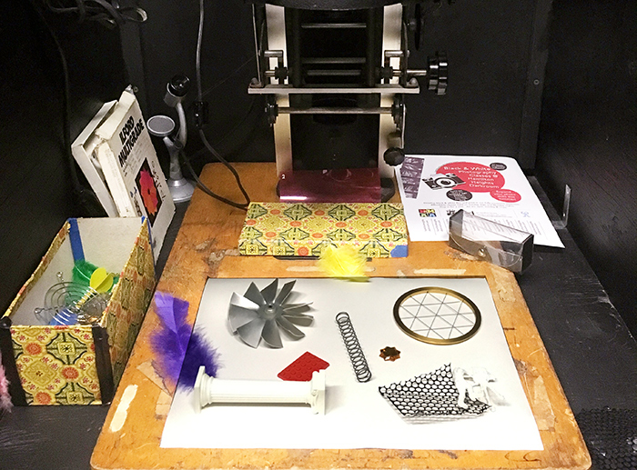 This is a fun introduction to the darkroom class. Students place objects on photographic paper and expose them to light, then develop the paper in our darkroom. The unusual combinations are personal expressions that utilize the student’s intuition.