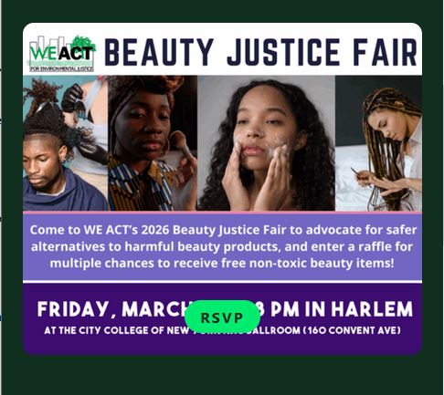 Come to WE ACT’s 2026 Beauty Justice Fair and learn about the dangers, how you can help advocate for safer alternatives, and receive free non-toxic beauty items. You can also learn about colorism and racism in the beauty industry and the importance of passing the New York State Beauty Justice Act while exploring hands-on activities, creative projects, and DIY stations. In addition, we will have local clean beauty businesses on-hand and offer free food, drinks, and merch!