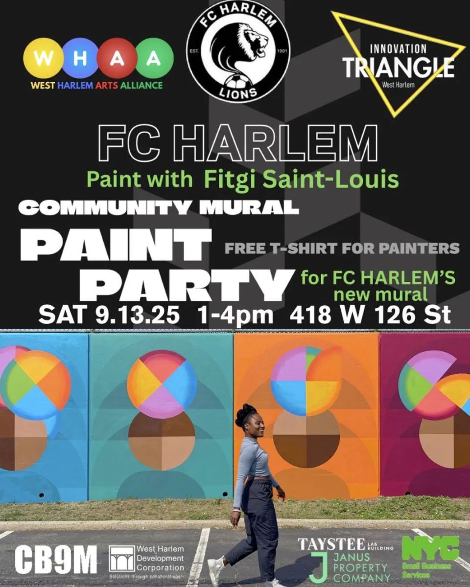 Join Harlem-based artist Fitgi Saint Louis (@fitgisaintlouis) and FC Harlem (@fcharlem) for a hands-on community paint party! Together, we’ll bring to life a 96×8 foot mural that will become part of Harlem’s creative landscape.
