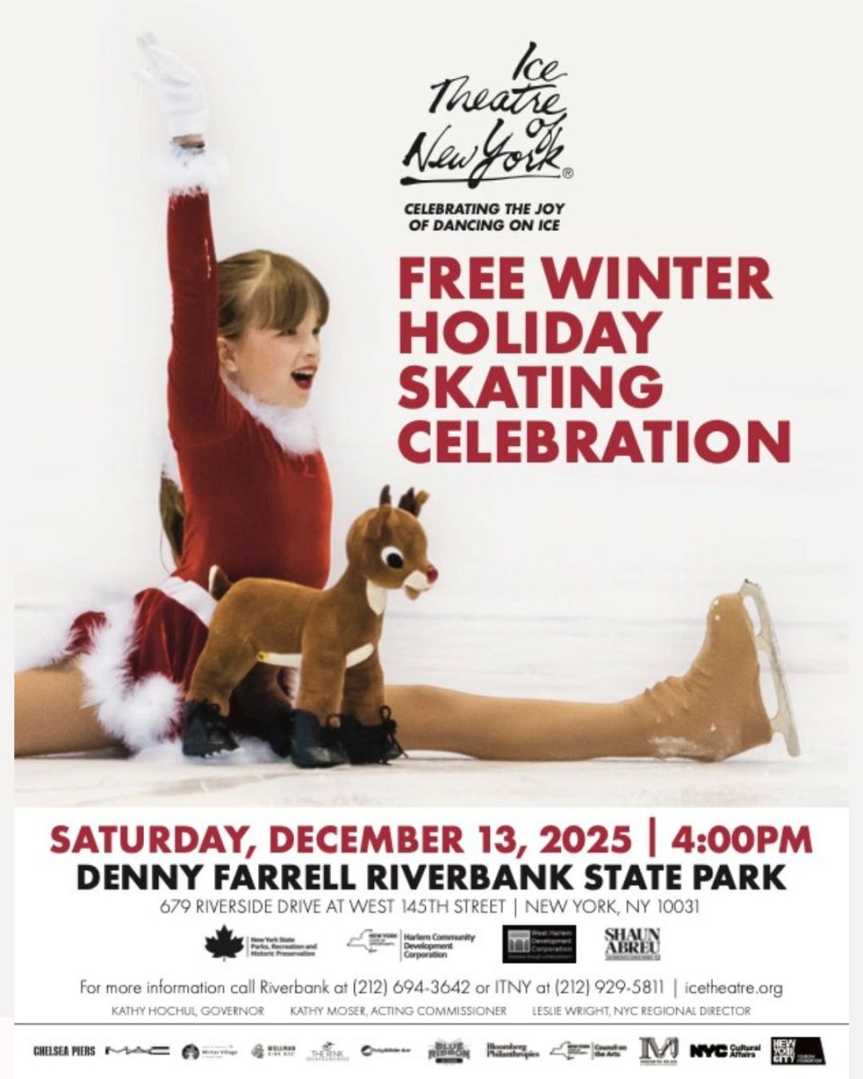 Celebrate the season on ice! Ice Theatre of New York invites families, neighbors, and skating fans to a joyful Free Winter Holiday Skating Celebration at Denny Farrell Riverbank State Park.