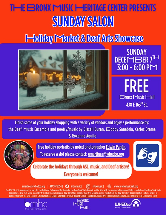 Finish your holiday shopping with amazing local vendors and enjoy powerful performances by the Deaf Music Ensemble, plus poetry & music by Gissell Duran, Bobby Sanabria, Carlos Orama, and Roxanne Aguilo