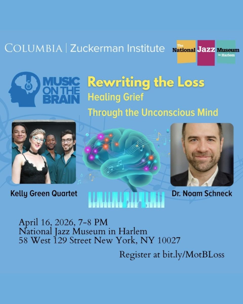 An intimate evening of live jazz and neuroscientific discovery that explores how the unconscious mind processes grief. Through the lens of Dr. Noam Schneck’s research, audiences will reflect on the “hidden” map of loss and how the brain creatively adapts. Acclaimed pianist and vocalist Kelly Green and her quartet perform original compositions connecting music and emotional experience. This program is presented by Columbia University’s Zuckerman Mind Brain Behavior Institute in partnership with the National Jazz Museum in Harlem.
