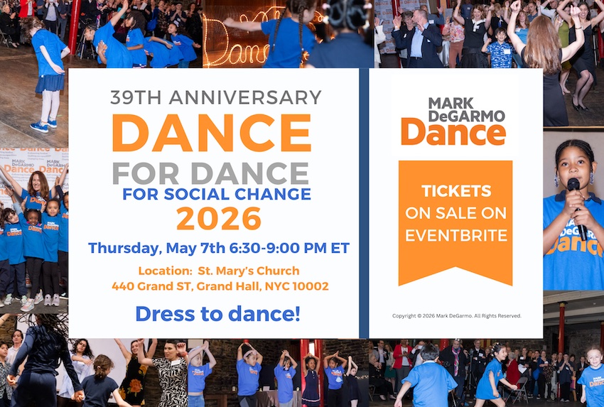 Mark DeGarmo Dance’s Dance for Dance for Social Change 2026 celebrates MDD’s 39th and 44th anniversaries as a leading NYC not-for-profit dance organization dedicated to education, performance, and intercultural community-building. The community event celebrates our 39- and 44-year commitment to provide our evidence-based dance program to the least-resourced public elementary students, schools, families, and communities across NYC. Without our support, funding and dedication our school partners rarely provide evidence-based dance education programs. The celebration includes a presentation with refreshments, a silent auction, a dance lesson, dancing, and students performing. We honor internationally recognized performer, teacher, choreographer, and author, Dr. Daniel Lewis, with our “Educational Visionary” Lifetime Achievement Award 2026 presented by Dante Puleio, Artistic Director of the José Limón Dance Company.